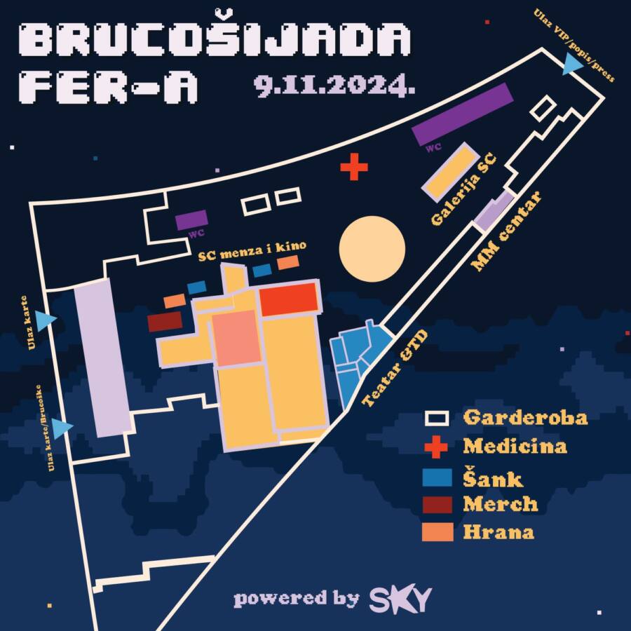 Na prostor Brucošijade FER-a nije dozvoljeno unositi pića ni hranu, a nakon što jednom uđete na prostor festivala, radi sigurnosnih razloga nije moguć ponovni ulazak. Ostala pravila ponašanja pogledajte na poveznici. Za sve dodatne informacije pratite Instagram i Facebook page Brucošijade FER-a. Regularne karte po cijeni od 17 € mogu se još danas nabaviti na FER-u i u SC-u. Ako ih ostane, cijena karte na ulazu iznosit će 20 €.