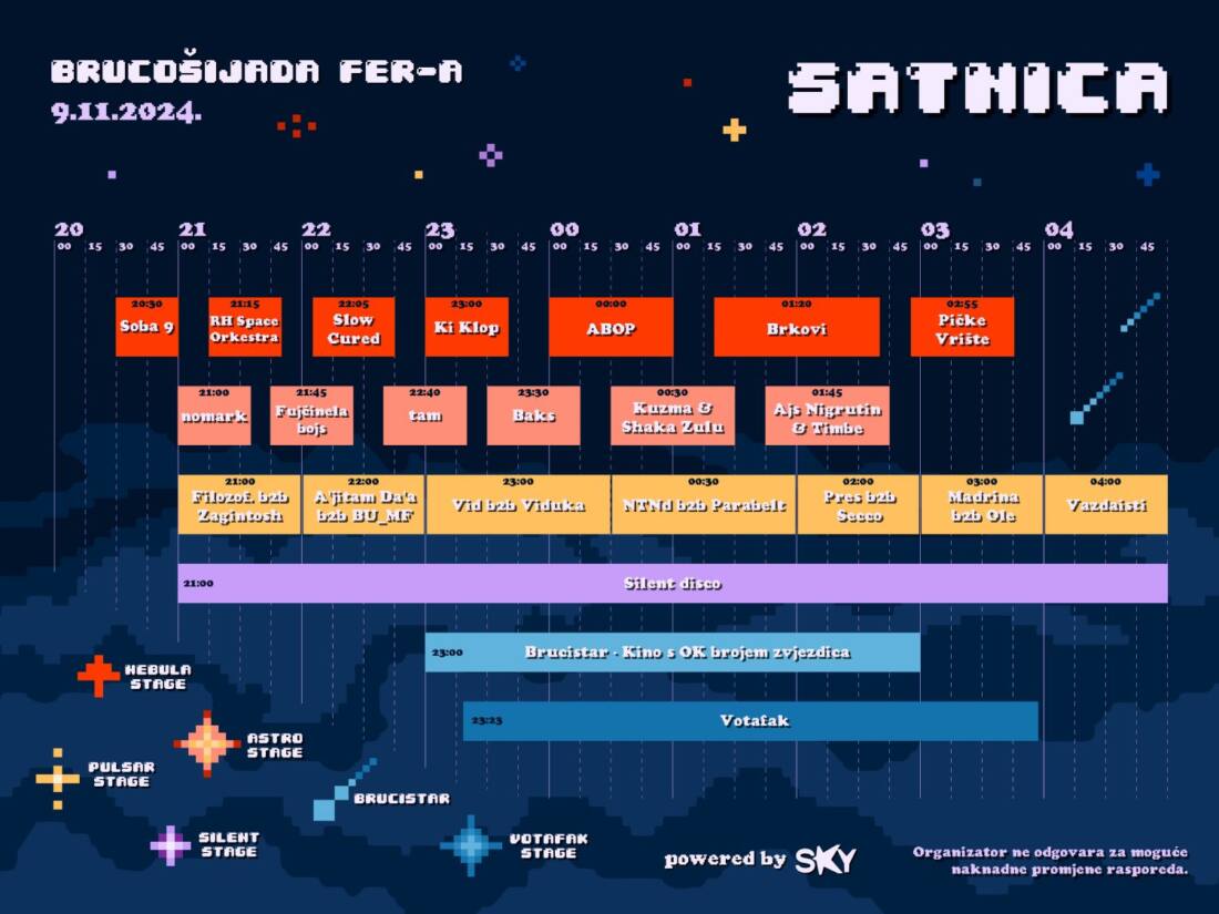 Brucošijada FER-a tradicionalno okuplja veliki broj studenata i ljubitelja glazbe, a u subotu, 9.11. u SC-u slušamo 14 izvođača na tri stagea. U već standardnoj ponudi naći će se i kino i Votafak stage, a Teatar &TD se pretvara u “tihi” podij na kojem će se posjetitelji zabavljati do sitnih jutarnjih sati uz trash, rap i Ex-Yu.